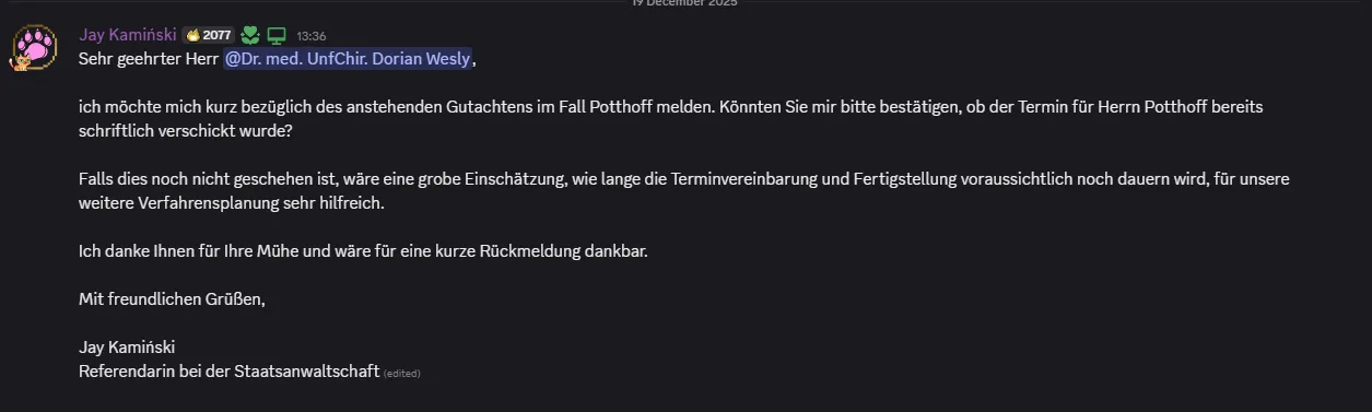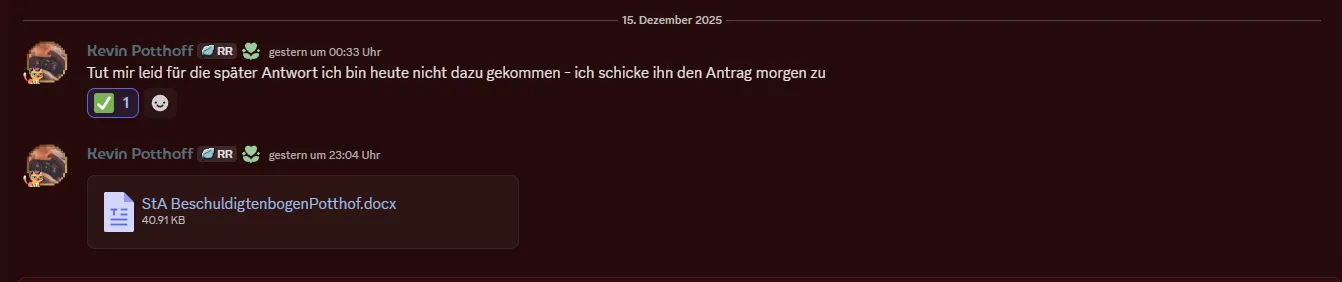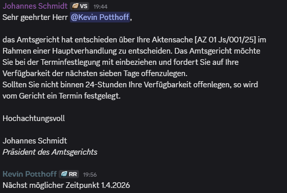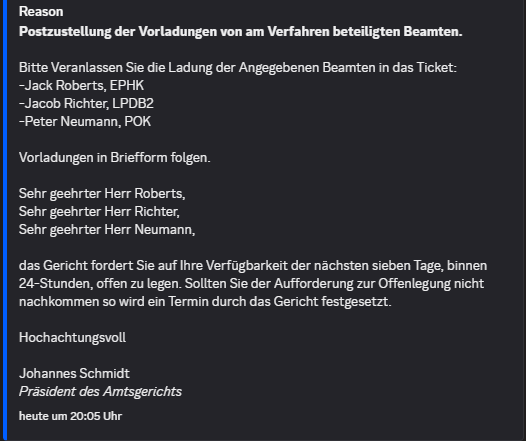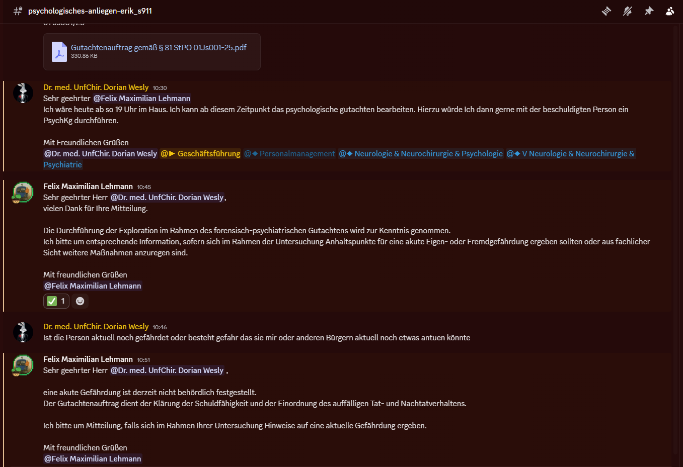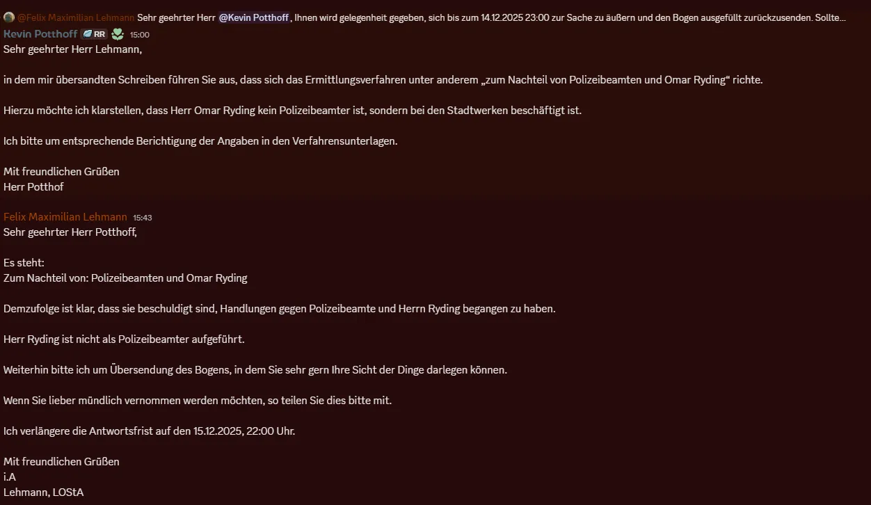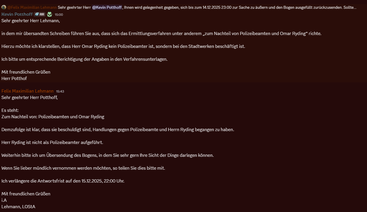 Am 12.12.2025 gegen 23:00 Uhr wurde durch mich, EPHK Jack Roberts, unter Mitwirkung der Polizeibeamten LPDB2 Jakob Richter und POK Peter Neumann, folgender Sachverhalt auf dem Parkplatz der Polizeiinspektion Ruhrstedt sowie im Dienstgebäude aufgenommen.